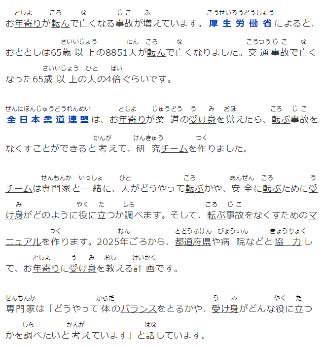 全日本柔道連盟は、お年寄りが柔道の受け身を覚えたら、転ぶ事故をなくすことができると考えて、研究チームを作りました。
