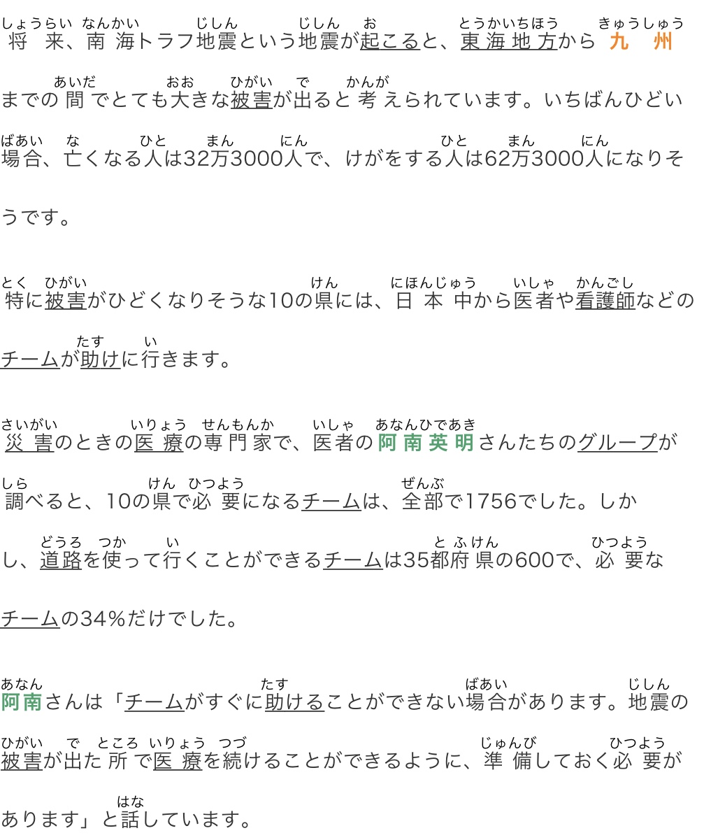 災(zāi)害のときの醫(yī)療の専門家で、醫(yī)者の阿南英明さんたちのグループが調(diào)べると、10の県で必要になるチームは、全部で1756でした。しかし、道路を使って行くことができるチームは35都府県の600で、必要なチームの34%だけでした。