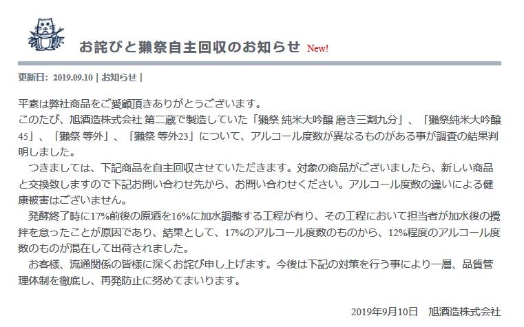 按照該公司的生產規則,上述產品需要往酒精度數17度左右的原酒中加水,稀釋至16度。可是上述產品的擔當者在加水后沒有充分攪拌,導致生產出來的產品酒精度數變成17度至12度不等。本月8日,該公司在進行內部品質檢查時發現這一問題,于是決定從11日開始召回相關產品。據悉,此次召回的數量大約為旭酒造公司一年出貨量的3%左右。