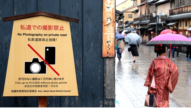“私家道路禁止拍照”、“請(qǐng)不要觸摸提燈”等提示牌設(shè)立在花見小路上。在位于京都市東山區(qū)的花街祇園,因到訪的觀光客而帶來的困擾,甚至已經(jīng)成為了觀光公害。當(dāng)?shù)鼐用癜l(fā)出了“這樣下去祇園的風(fēng)情就會(huì)消失”的聲音,日本國土交通省等也在不間斷進(jìn)行著通過智能手機(jī)呼吁遵守禮儀的實(shí)證試驗(yàn)。